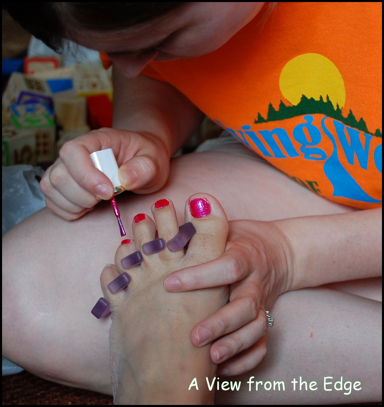 What you don't see and hear (Thank GOD) is me laughing hysterically with the tears running down my face. You see, I am really, REALLY ticklish. It is really difficult to get that toe separator doohickey between my toes. I squeal, cry, and laugh all at the same time, while trying to hold in my pee. It is quite a sight to see.