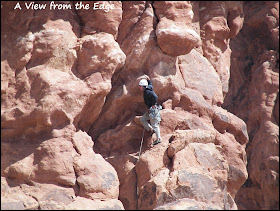 This is the largest and most famous of the balanced rocks in the park. It is known as, "Balanced Rock". The total rock formation stands 128 feet tall, the boulder height alone is 55 feet. The boulder weighs a hefty 3,500 TONS. (Gee, I wonder where they got a scale big enough to WEIGH that sucker?) Just to give you an idea of how large that rock is, look at that teeny tiny man by the pink arrow. Actually, he's a normal sized man; he's just dwarfed by the huge rock.